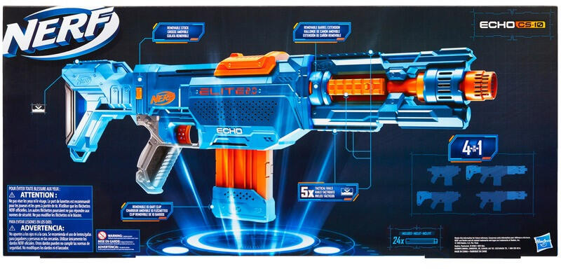 Doboz tartalma : 1 db Echo blaster alaprész, 1 db levehető cső, 1 db levehető kolb („stock), 1 db tár (clip) 12 lövedék befogadására, 24 db Nerf Elite 2.0 lövedék (12 kék + 12 narancssárga)